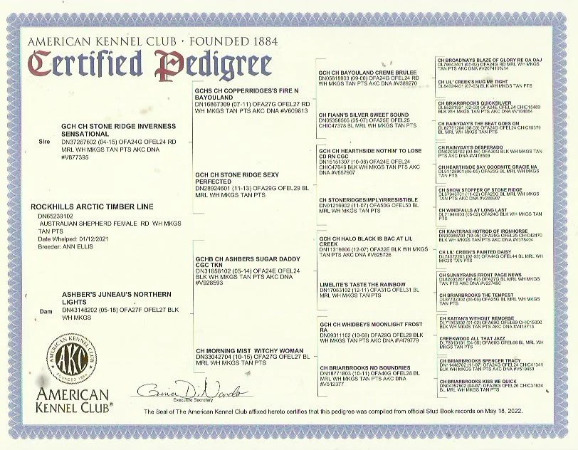 Timber is cleared by parentage. Meaning both parents have clear genetic panels, therefore, Timber is as well. I am happy to provide those when needed. Below are the only tests not cleared by parentage, which is MDR1 and eyes, which are tested yearly. Testing and registration upon request.